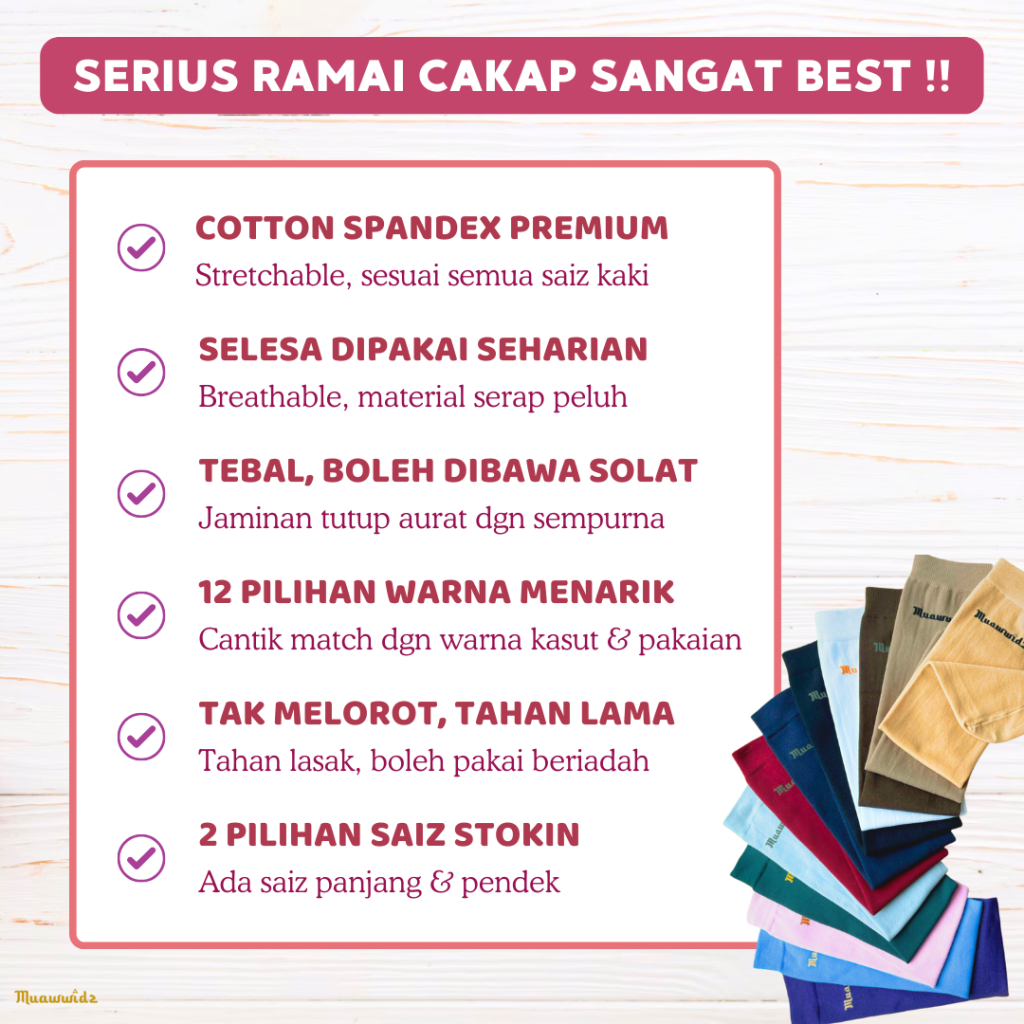 Premium cotton spandex. Pastinya selesa, sejuk, stretchable. Berbeza dari stokin biasa.